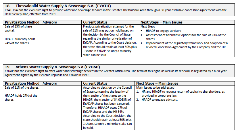 L’Observatoire des multinationales a consacré deux enquêtes auxprivatisations imposées à la Grèce en général et en particulier à la tentative de privatisation des services de l’eau d’Athènes et de Thessalonique. L’entreprise Suez environnement était considérée comme favorite pour racheter ces deux entreprises, mais la tentative avait fini par avorter, en raison de la combinaison d’une forte résistance locale (un référendum local non contraignant organisé à Thessalonique avait donné un résultat sans appel de 98% des votants contre la privatisation) et d’une décision du Conseil d’État grec qui avait déclaré la privatisation de l’eau inconstitutionnelle, car le service touche aux besoins vitaux des citoyens.